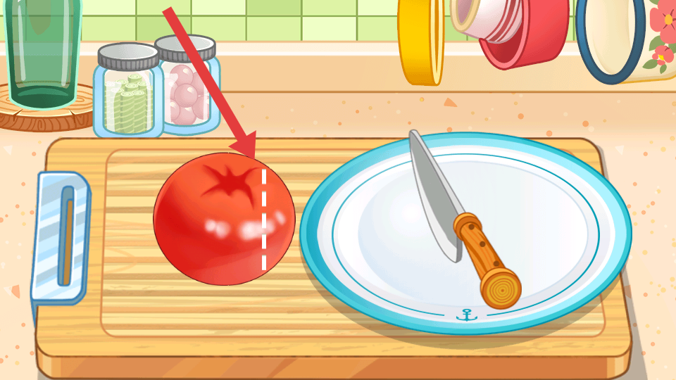 3、切換到充滿生活氣息的廚房區域,操作臺上擺放著新鮮食材,按箭頭指引,拿起刀具,對準紅色番茄身上的虛線,穩穩地將番茄切開。