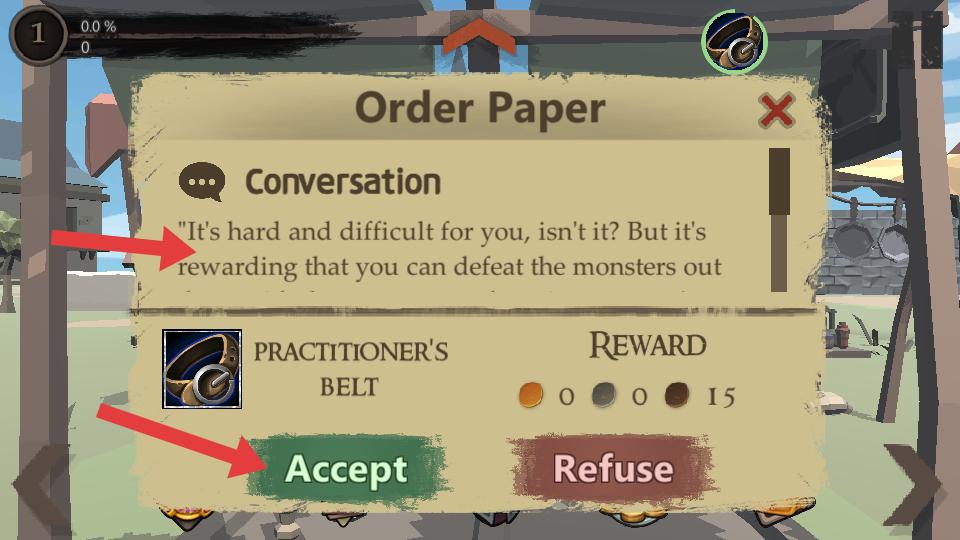 1、在訂單界面查看對話與獎勵,點擊Accept接受PRACTITIONERS BELT制作訂單,開啟任務。