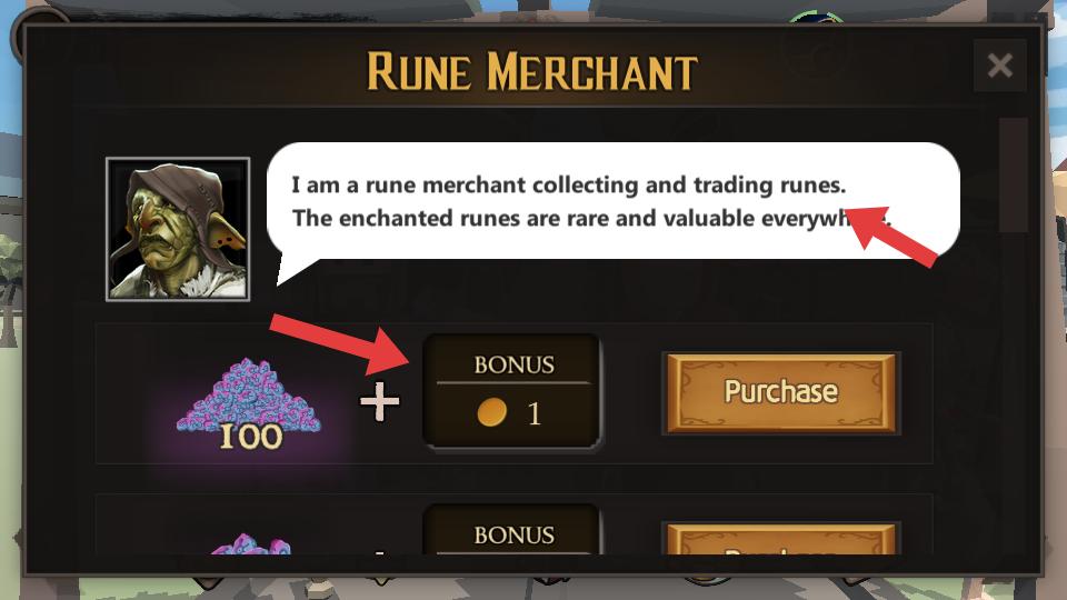 3、與符文商人對話,了解符文交易,點擊加號消耗對應貨幣,獲取BONUS獎勵,兌換珍貴符文。