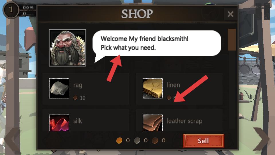 4、進入商店,依據鐵匠提示挑選所需物品,查看linen等商品價格,準備進行交易或售賣。