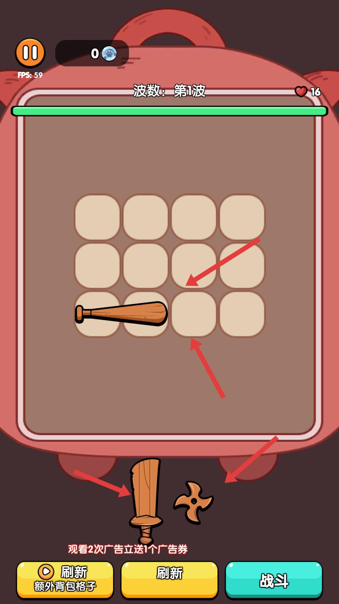 2、戰斗準備階段,可將下方的武器,如棒球棍、木劍、手里劍等,拖動到上方格子中,布置好武器后,點擊戰斗按鈕開始迎戰敵人。