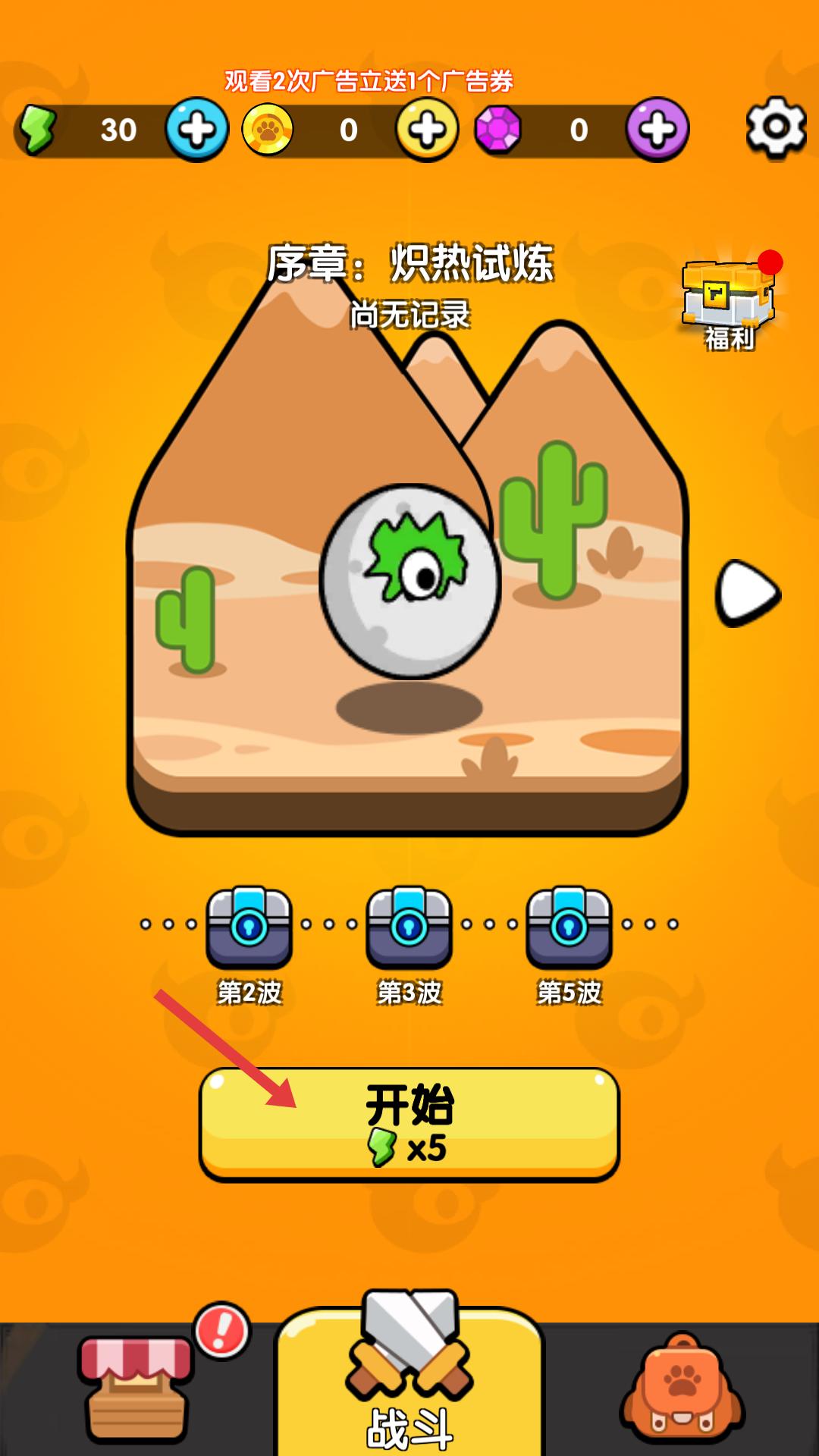 1、玩家下載游戲登入游戲頁面后,點擊開始按鈕,消耗5個綠色道具,即可進入戰斗,開啟第一波挑戰。