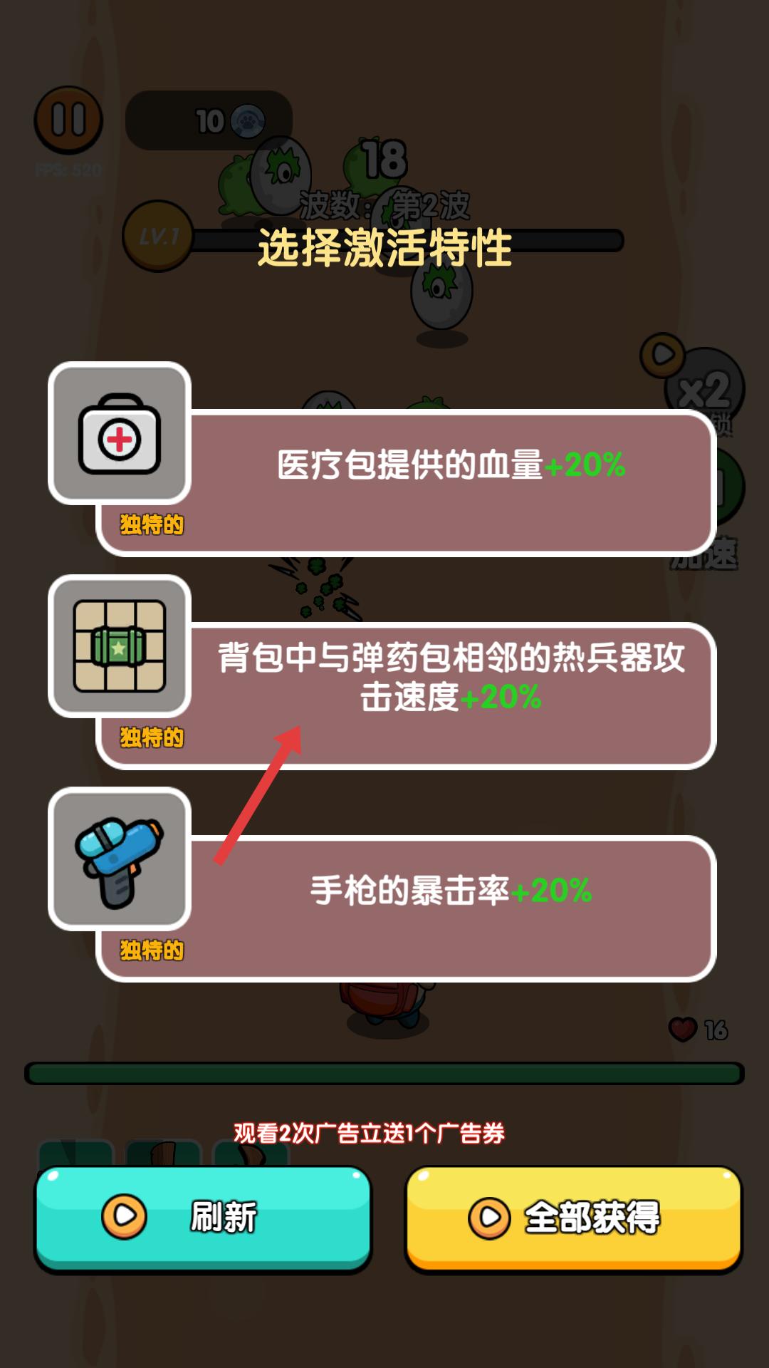 4、會出現選擇激活特性界面,可根據戰斗需求,選擇如提升醫療包血量、熱兵器攻擊速度、手槍暴擊率等特性,增強戰斗能力。