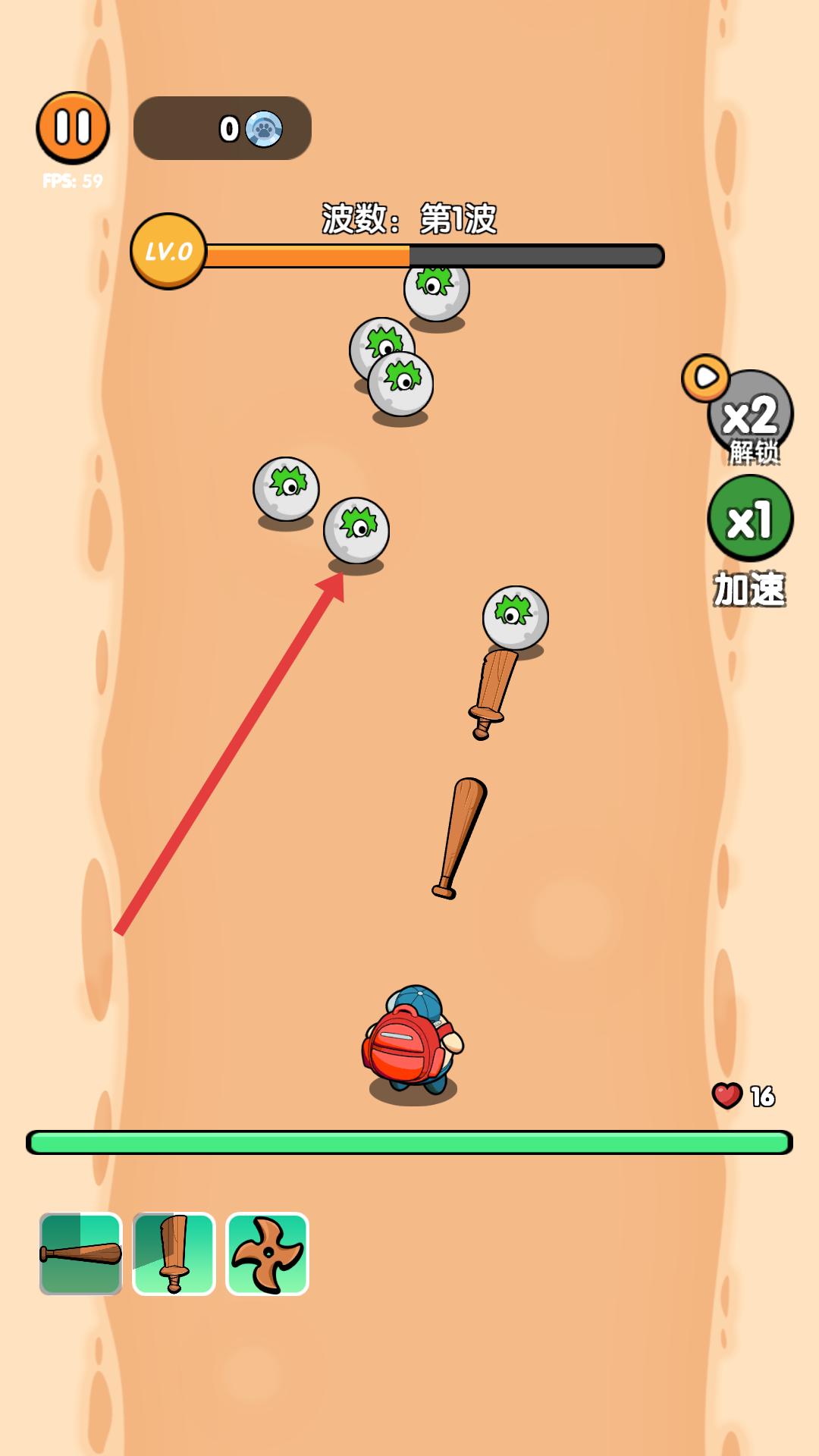 3、戰斗時,敵人會從上方襲來,布置的武器會自動攻擊敵人,要留意敵人的數量和移動速度,同時關注自身等級和血量。