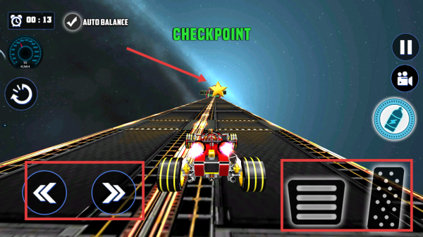 3、玩家需要通過屏幕左下角的左右方向虛擬按鈕控制轉向,屏幕右下角的加速和剎車,在游戲里面注意收集星星等獎勵。