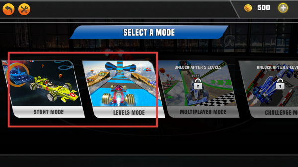 2、進入模式選擇界面后,可選擇STUNT MODE特技模式或LEVELS MODE關卡模式等,不同模式下游戲體驗和目標不同。
