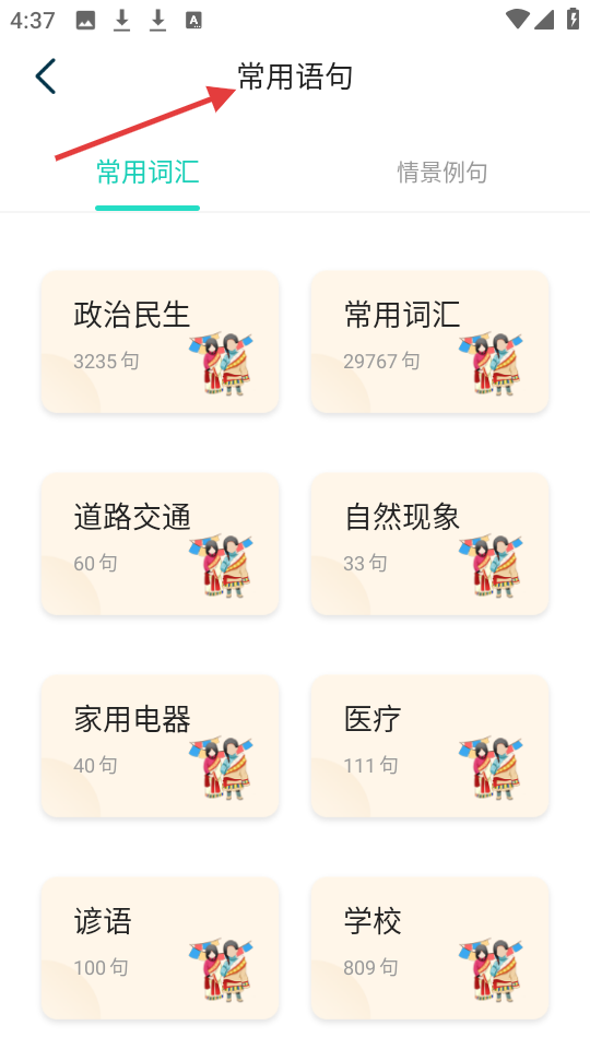 2、常用語句頁劃分常用詞匯、情景例句,涵蓋政治民生、醫療等多領域語句,滿足語言學習需求。