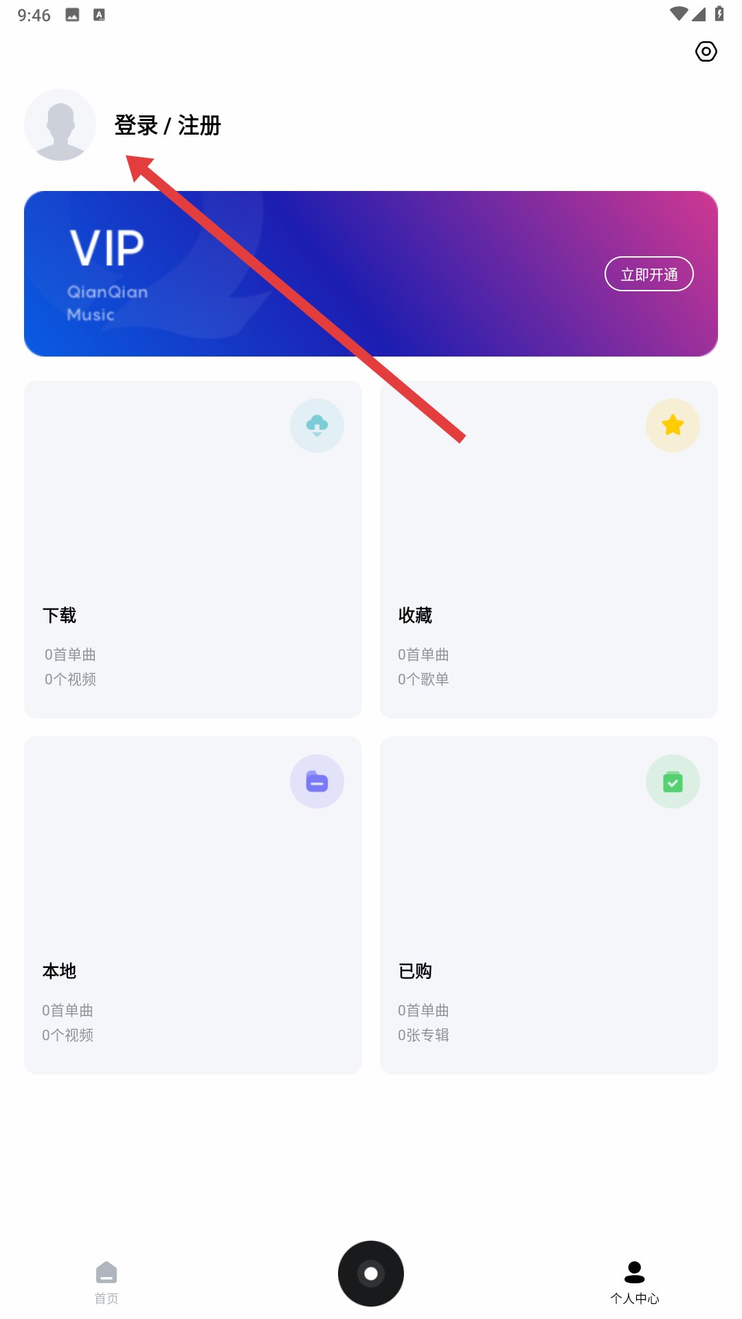 1、打開音樂APP首頁,點擊底部導航欄右側的個人中心按鈕,進入個人中心頁面,該頁面可查看下載、收藏等音樂相關信息。