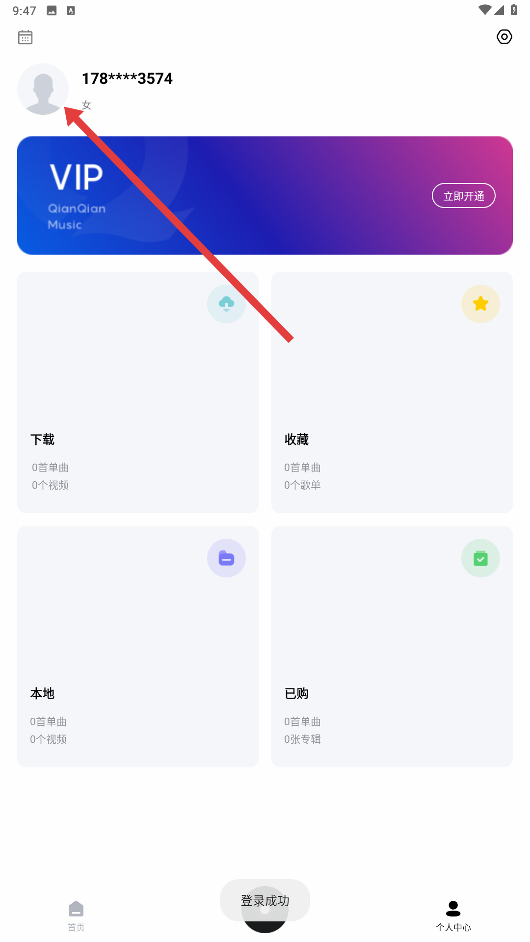 4、個人中心頁面,點擊頭像區域,可進入個人信息編輯頁面,查看或修改個人頭像、性別等信息,方便個性化使用音樂APP。