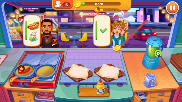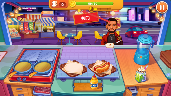 3、持續為顧客制作對應的美食,如熱狗、飲品等,完成后能獲取金幣,推動關卡進度,積累經營成果。