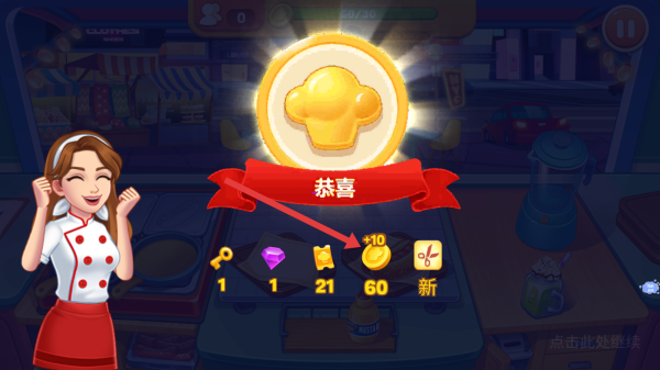 4、成功完成關卡任務后,會顯示恭喜界面,可獲得金幣、鉆石、鑰匙等獎勵,為后續經營助力。