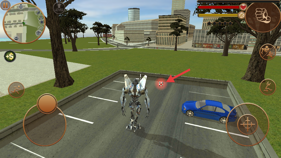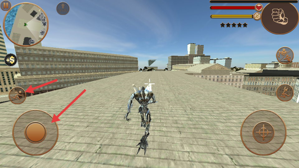 1、玩家操控機器人時,利用左側搖桿移動,搭配旁邊的動作按鈕,可在城市屋頂等區域自由行動,探索游戲里不同場景。