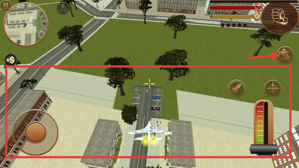 2、點擊右邊對應按鈕,機器人能切換到飛行形態,在空中借助火箭等按鈕,對地面目標發起攻擊,可以拓展行動范圍。