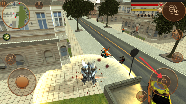 3、玩家遇到敵人時,使用右側瞄準按鈕鎖定目標,再配合攻擊操作可精準打擊敵人,在城市街道上高效戰斗。