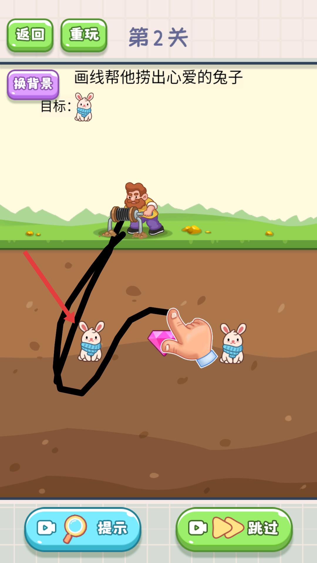 2、按照提示畫線,幫助角色撈出心愛的兔子,要注意線條的走向,確保能成功撈到兔子。