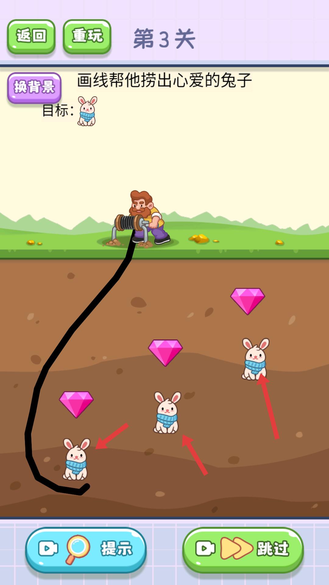 4、第3關同樣是畫線幫角色撈出心愛的兔子,此時有三只兔子,畫線時要規劃好路徑,盡量讓線條能覆蓋到兔子。
