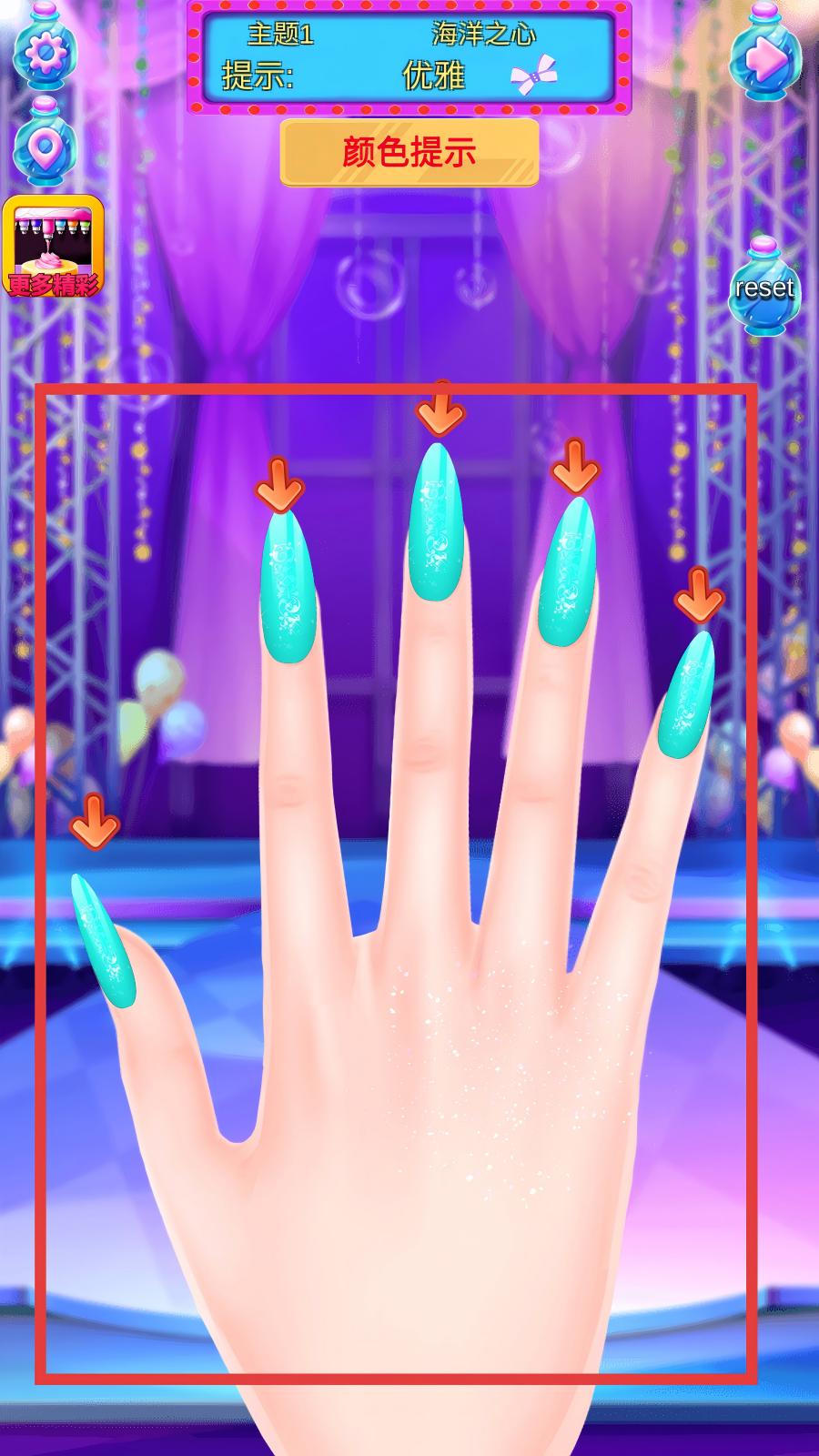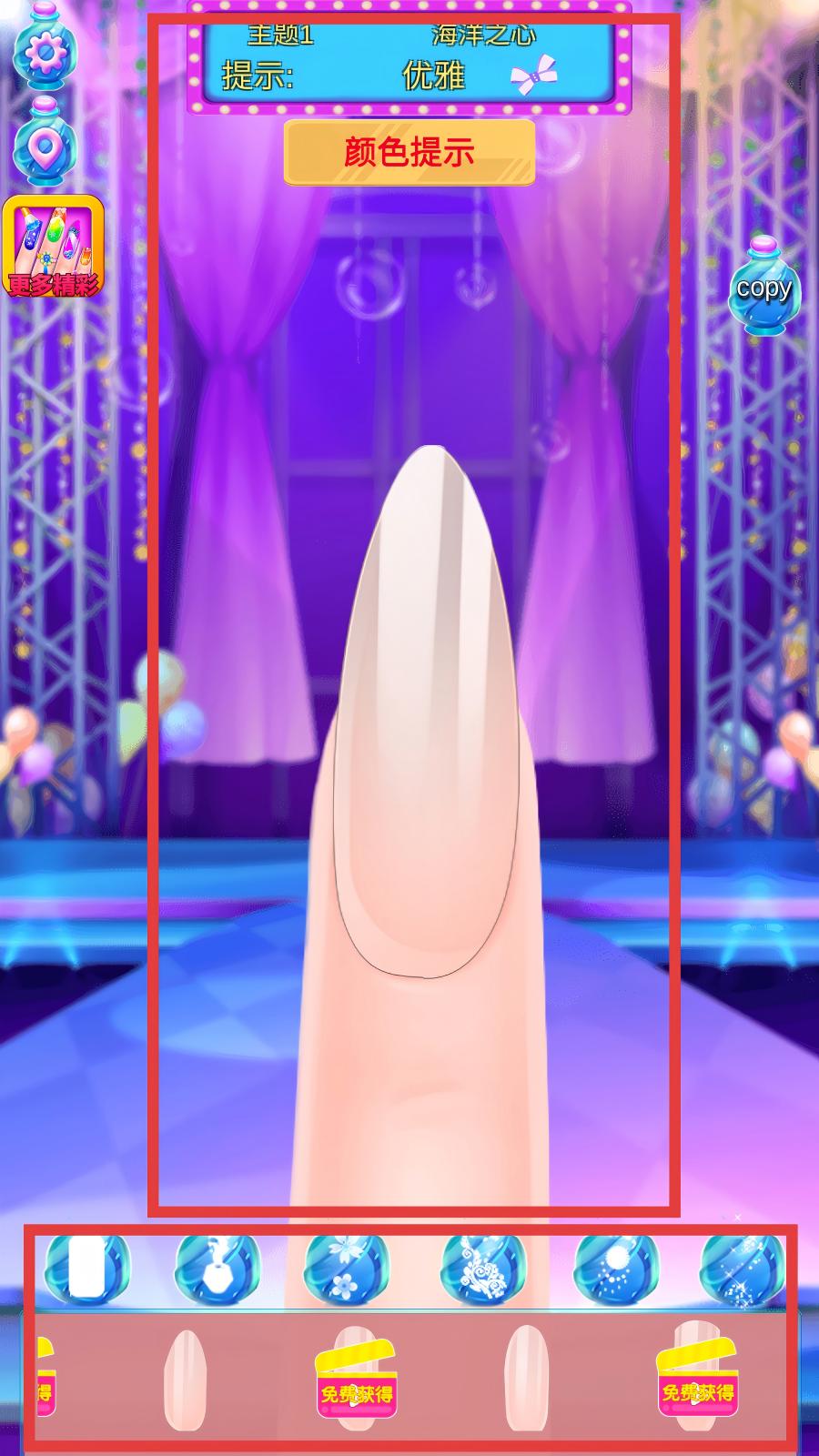 4、底色涂抹完成后,從道具欄選擇帶花紋的裝飾道具,點擊指甲,為指甲添加海洋之心主題花紋,重復操作,為每個指甲依次裝飾,確?;y與主題契合。