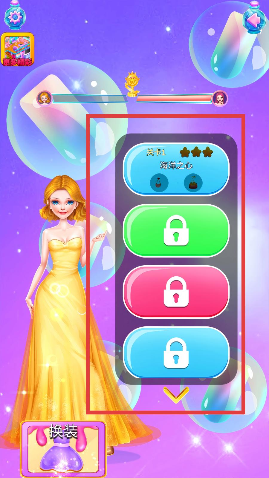 2、在關卡選擇頁面,頁面呈現關卡1海洋之心及多個鎖定關卡,點擊關卡1海洋之心按鈕,進入美甲挑戰關卡。
