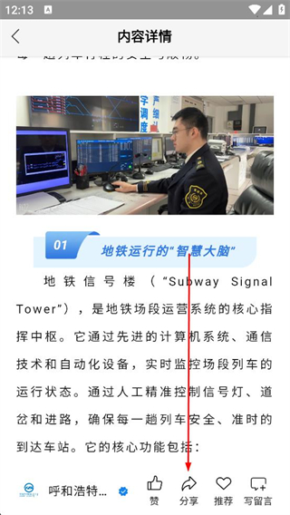 4、在內容詳情頁閱讀地鐵信號樓的相關介紹,了解其功能作用,找到頁面下方的分享按鈕,點擊可將該資訊分享給他人。