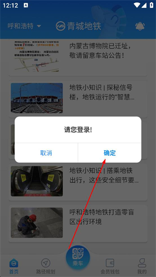1、打開青城地鐵軟件,進入首頁后點擊乘車按鈕,觸發請您登錄的彈窗,點擊確定按鈕,進入注冊賬號的登錄頁面。