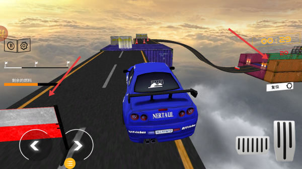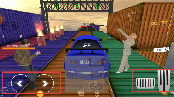 3、進入游戲場景后,通過屏幕左下角的左右方向虛擬按鈕控制豪車轉向,屏幕右下角的虛擬按鍵控制加速和剎車。