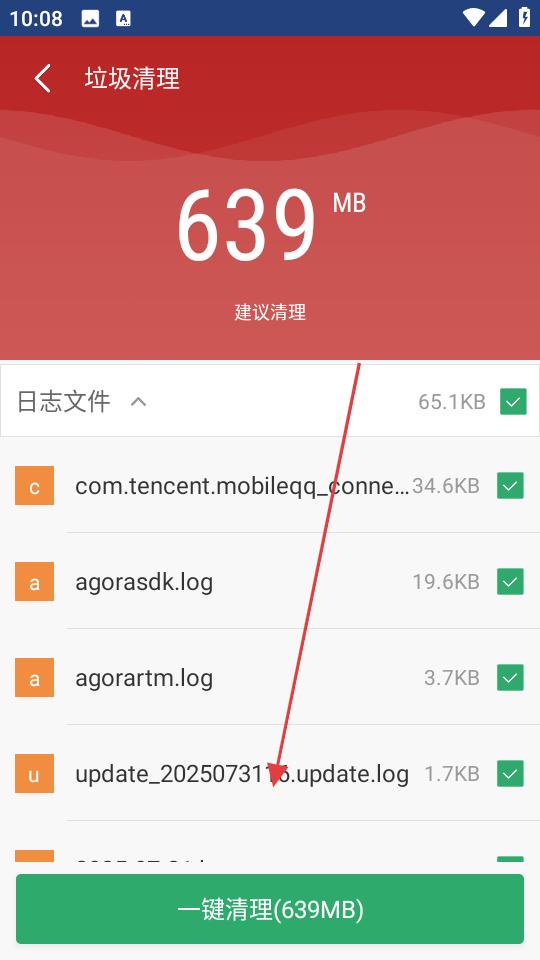 2、在垃圾清理頁面,確認掃描出的639MB垃圾,勾選日志文件等各類垃圾項,點擊一鍵清理,開始清除手機垃圾。