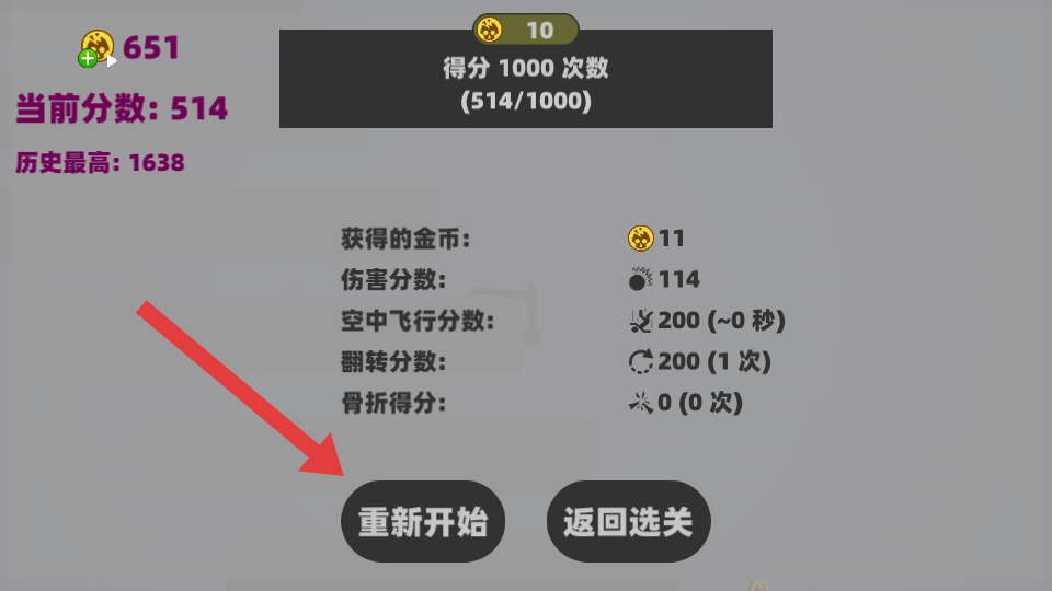 4、每次挑戰結束后,會展示得分等數據,可選擇重新開始再次挑戰,或是返回選關更換地圖。