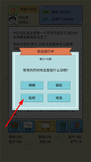 3、測試里還會出現藥材相關題目,比如問地龍對應的動物,可從蟑螂螻蛄蚯蚓地蟲里選,完成題目推進測試進度。