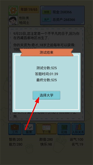4、測試結束后會顯示測試分數答題時間等信息,點擊選擇大學按鈕,即可進入后續選擇大學的人生階段。