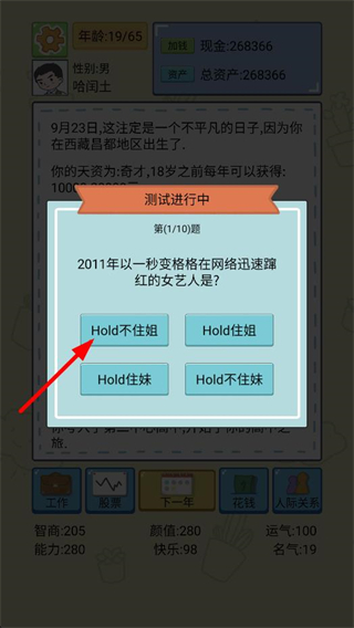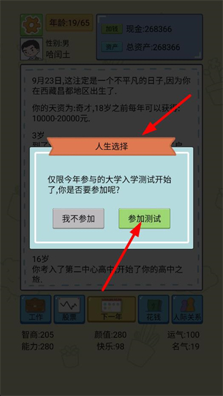 1、界面出現大學入學測試的人生選擇,可選擇不參加或參加測試,不同選擇會推進對應的人生發展路徑。