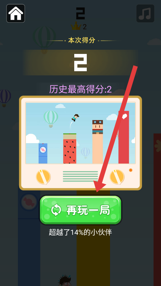3、一局結束后界面顯示得分及歷史最高得分,點擊再玩一局按鈕,重新開始挑戰沖擊更高分數。