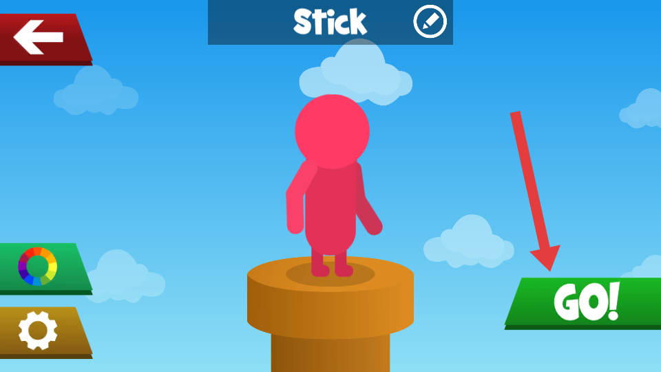 1、進入游戲點擊右側綠色GO按鈕,讓粉色火柴人從平臺出發,開啟障礙賽挑戰。