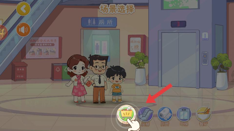 3、在場景選擇界面,有超市,扶梯,廁所等場景選項,點擊對應的場景圖標,可進入該場景體驗相關內容。
