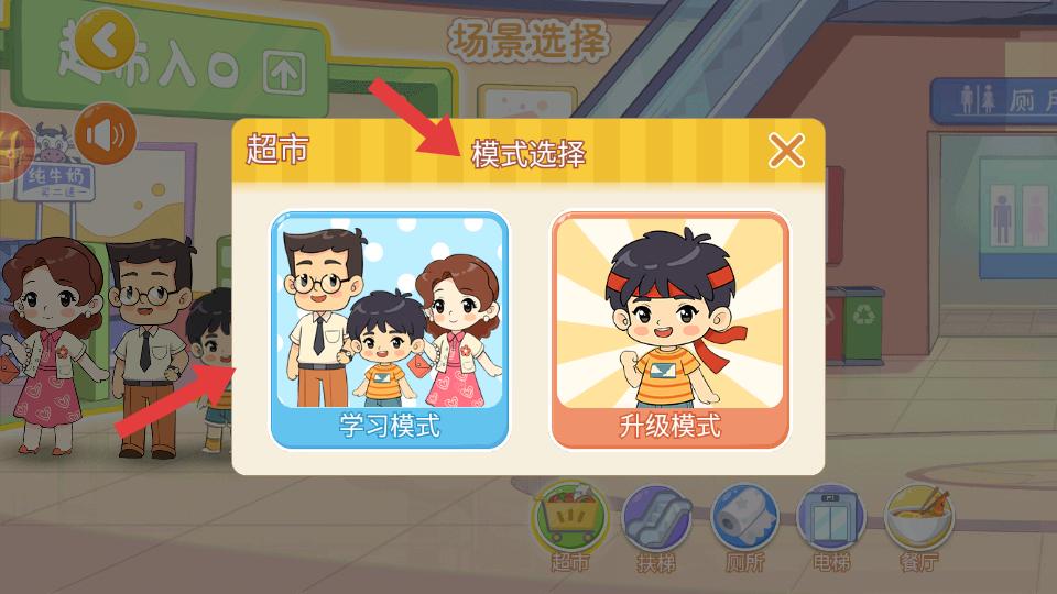 4、進入超市場景后,有學習模式和升級模式可選,選擇相應模式,就能到超市場景中開啟對應的游戲體驗。