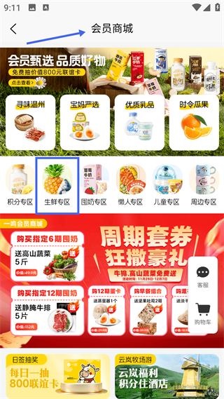 2、會員商城入口,進入會員商城頁面,涵蓋食品、生鮮等分類,按自身需求選擇板塊,解鎖會員專屬選購渠道。
