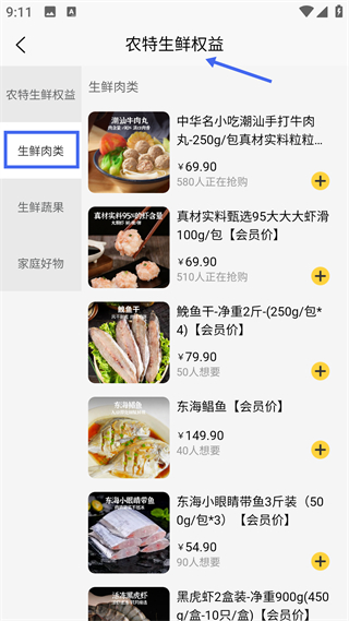 3、生鮮專區,進入農特生鮮權益頁面,專區聚焦生鮮類福利,是選購生鮮商品享受專屬權益的關鍵。