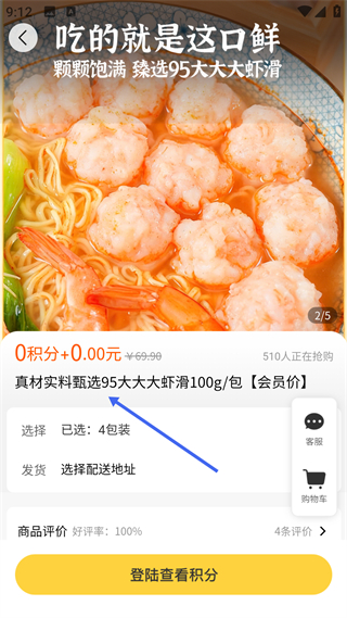 4、查看蝦滑商品詳情頁,可了解會員價、規格等信息,商品標注95蝦含量,支持0積分0元兌換,明晰權益可順利享受福利。