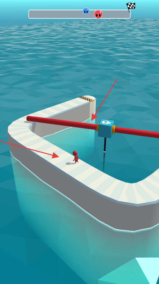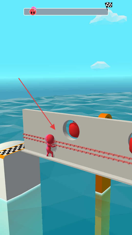 2、跑酷過程中操作紅色小人操作攀爬,穿過圓孔,避免被圓孔里的機關撞飛,保持速度,向終點沖刺。