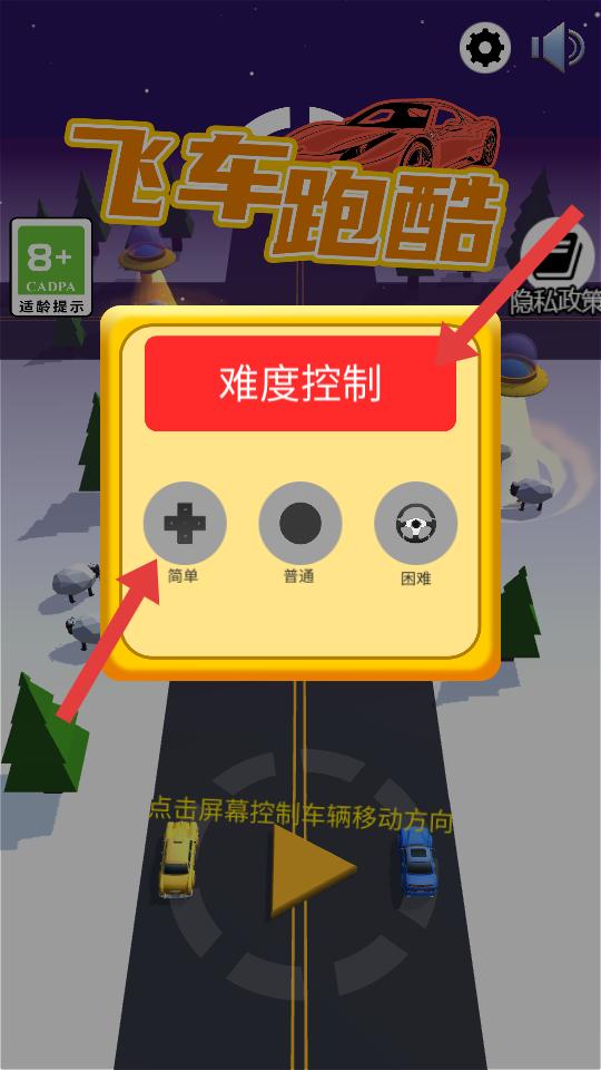 1、進入游戲會看到難度控制界面,有簡單,普通,困難三個選項,選擇合適難度后,即可開啟飛車跑酷。