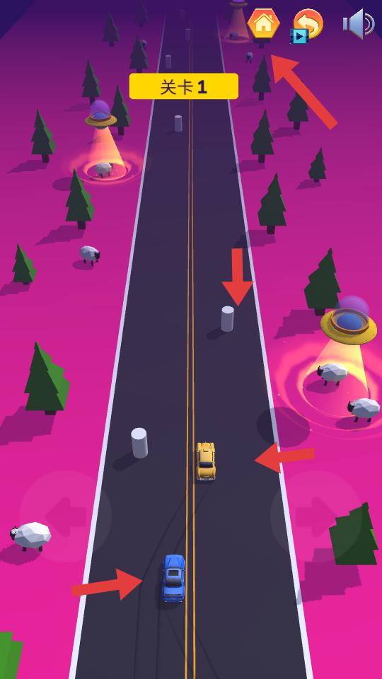 3、關卡1中,道路上有柱子等障礙物,還有其他車輛,要靈活操控自己的車,避開這些阻礙,持續前進。
