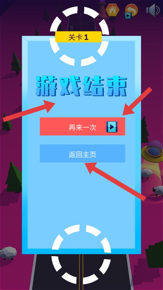 4、若車輛碰撞到障礙物或其他車輛,游戲會結束,出現游戲結束界面,此時可選擇再來一次或返回主頁。