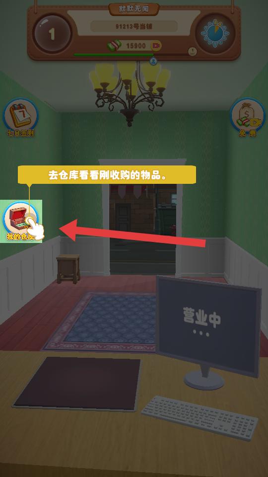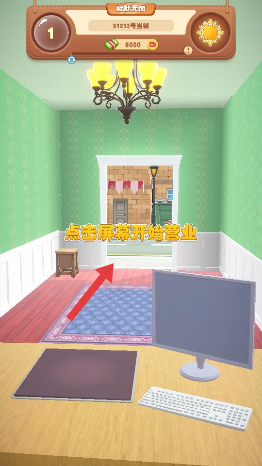 1、進入游戲,看到有吊燈,電腦等元素的當鋪界面,點擊屏幕開始營業,就能開啟當鋪的經營之旅,準備接待客人。