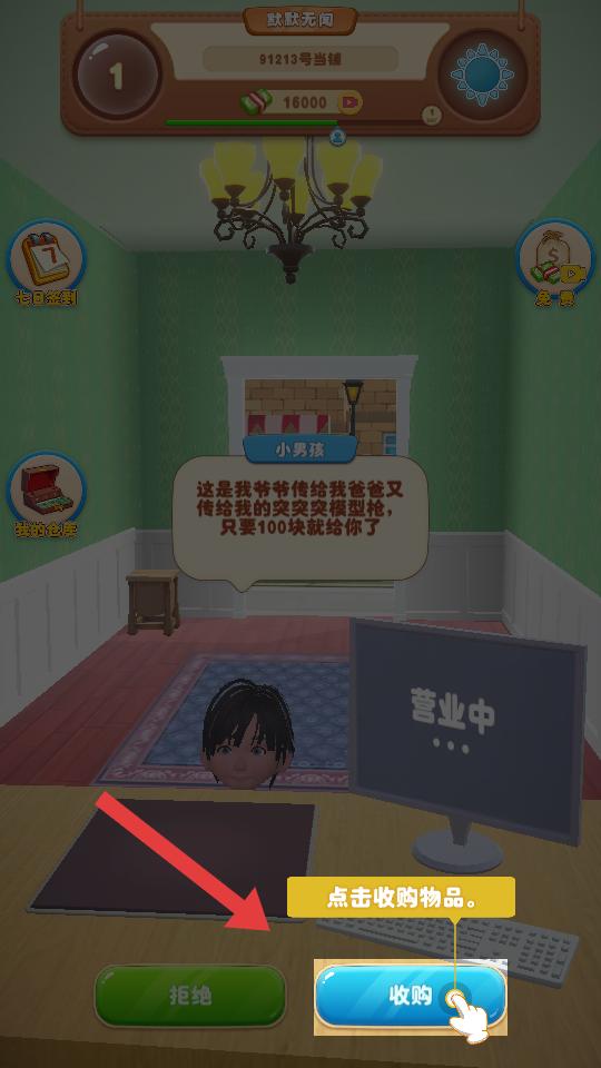2、營業中,會有客人帶著物品前來,像小男孩帶來的突突突模型槍,可選擇拒絕或收購,點擊收購就能獲得物品。