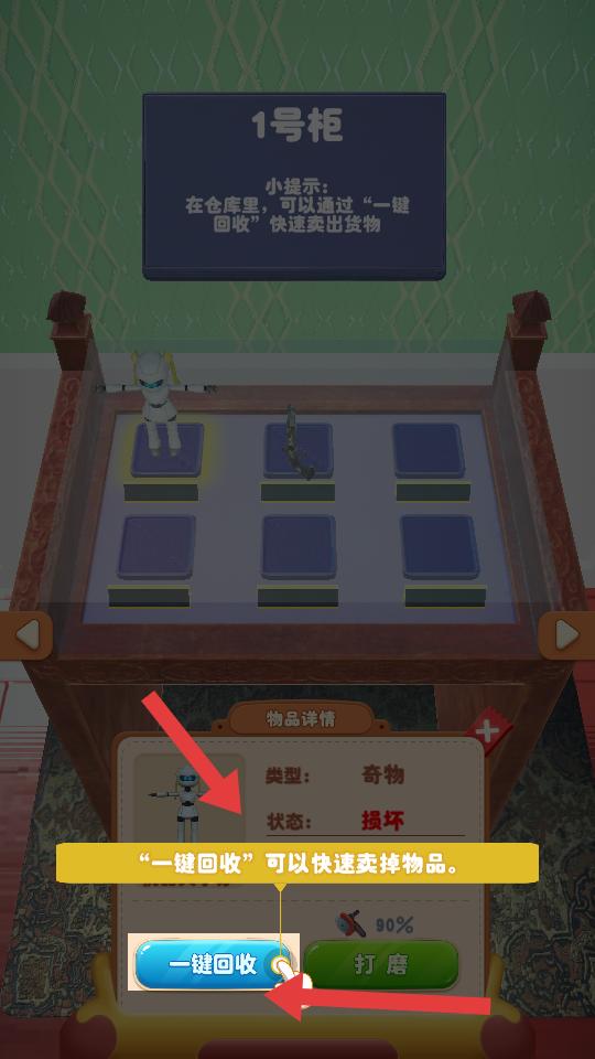 4、在倉庫里,能看到物品的類型,狀態等詳情,對于合適的物品,可使用一鍵回收功能,快速賣掉物品,獲取收益。