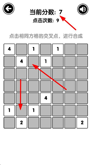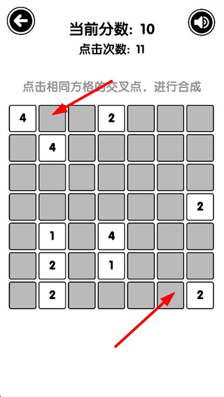 3、找到相同數字方格的交叉點并點擊,完成數字合成,同時積累分數和記錄點擊次數。