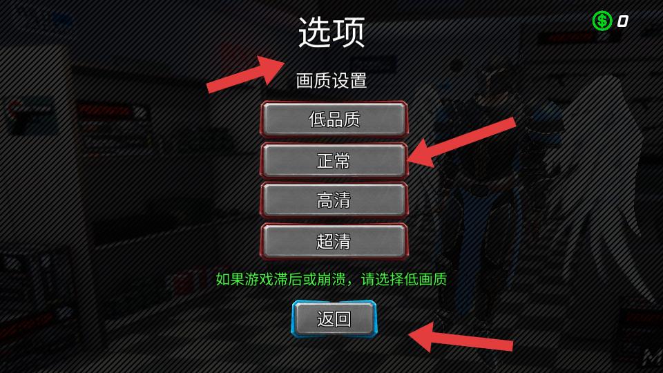 1、進入游戲,在選項界面,可根據設備情況選擇低品質,正常等畫質,若游戲卡頓,選低畫質,設置好后點擊返回。
