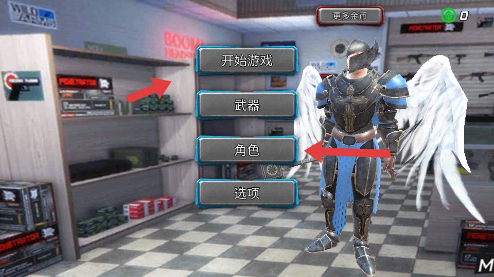 2、回到主界面,有開始游戲,武器,角色等選項,可先去武器或角色界面查看,準備,再點擊開始游戲,進入冒險。