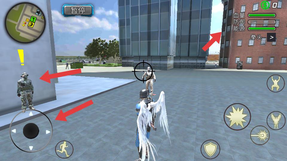 4、都市場景中,操控角色移動,與遇到的人物互動,利用右側技能等按鈕,應對場景中的情況,體驗超級英雄的冒險。