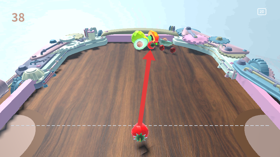 2、操控水果,讓其朝著其他水果移動,嘗試進行合成,合成后會獲得分數,推動游戲進程。