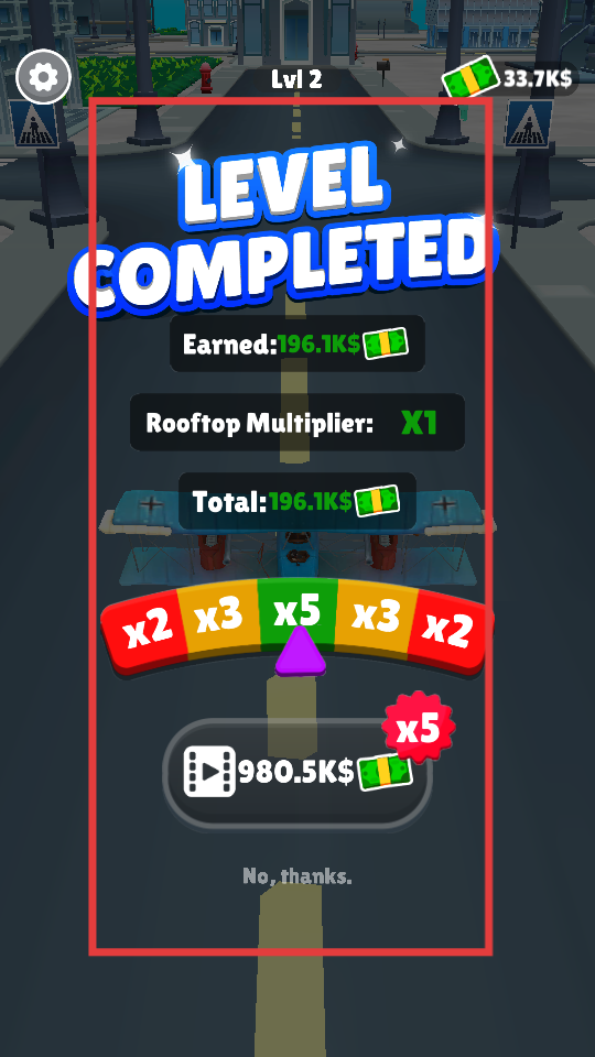 4、成功完成關卡后,會顯示獲得的金錢等信息,此時可以選擇觀看視頻來獲得更多金錢獎勵提升收益。